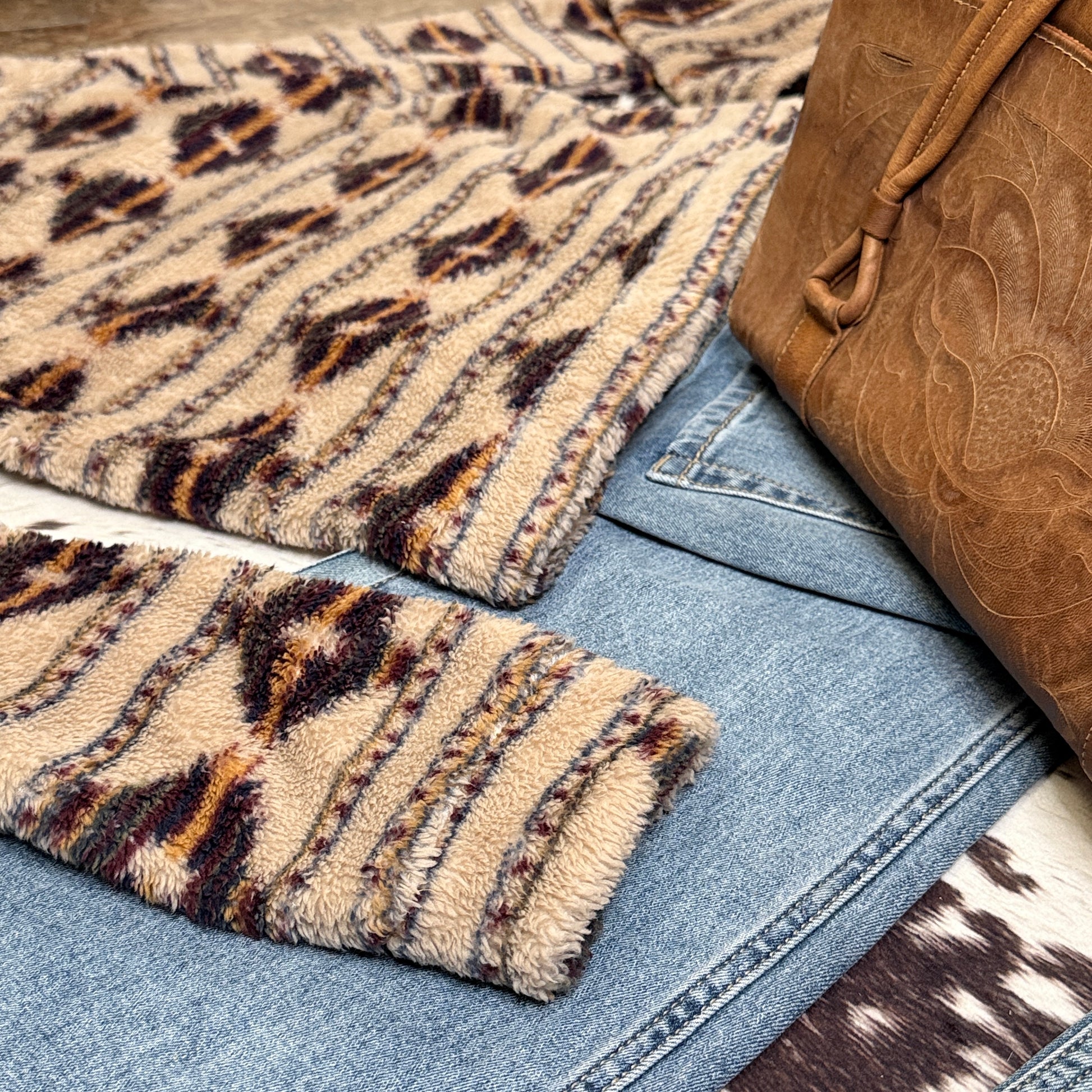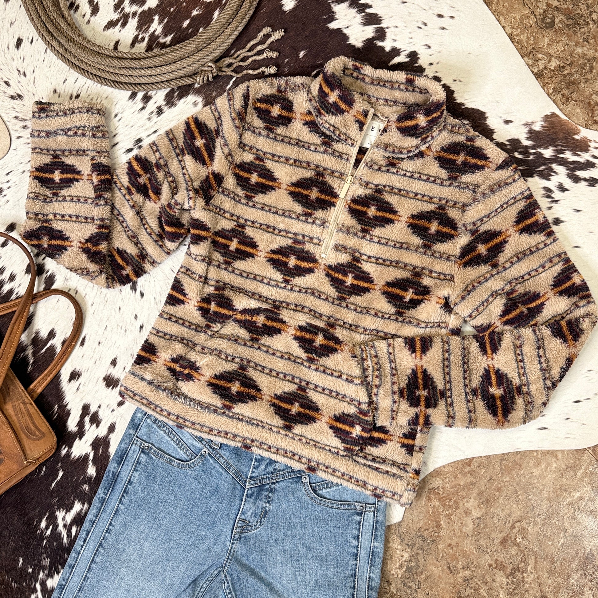 Cozy and so soft! This plush sherpa pullover 1/2 zip features a warm tan base with rich Southwestern tones of deep espresso brown, burgundy, mustard and muted rust woven into an Aztec stripe pattern.