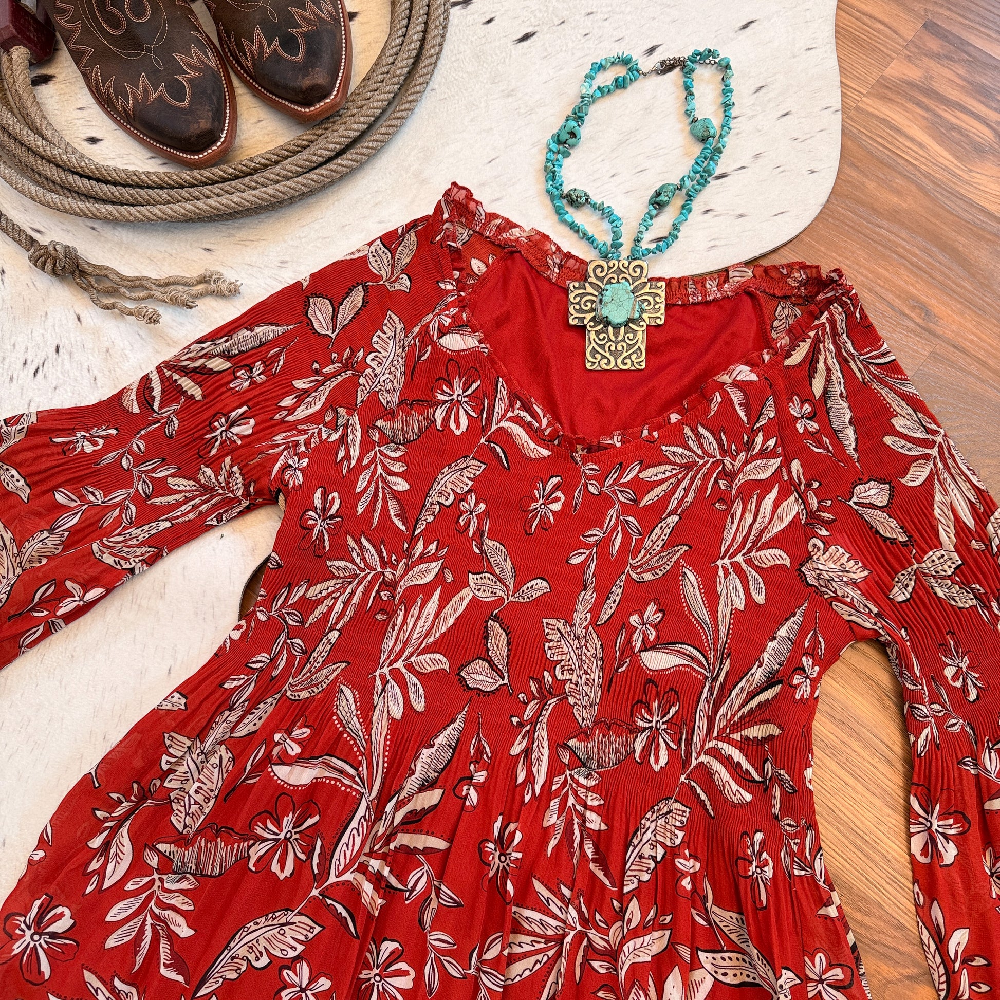Flowy fully lined rust red floral dress with a flattering V-neck, stretch-pleated bodice, and breezy bell sleeves.