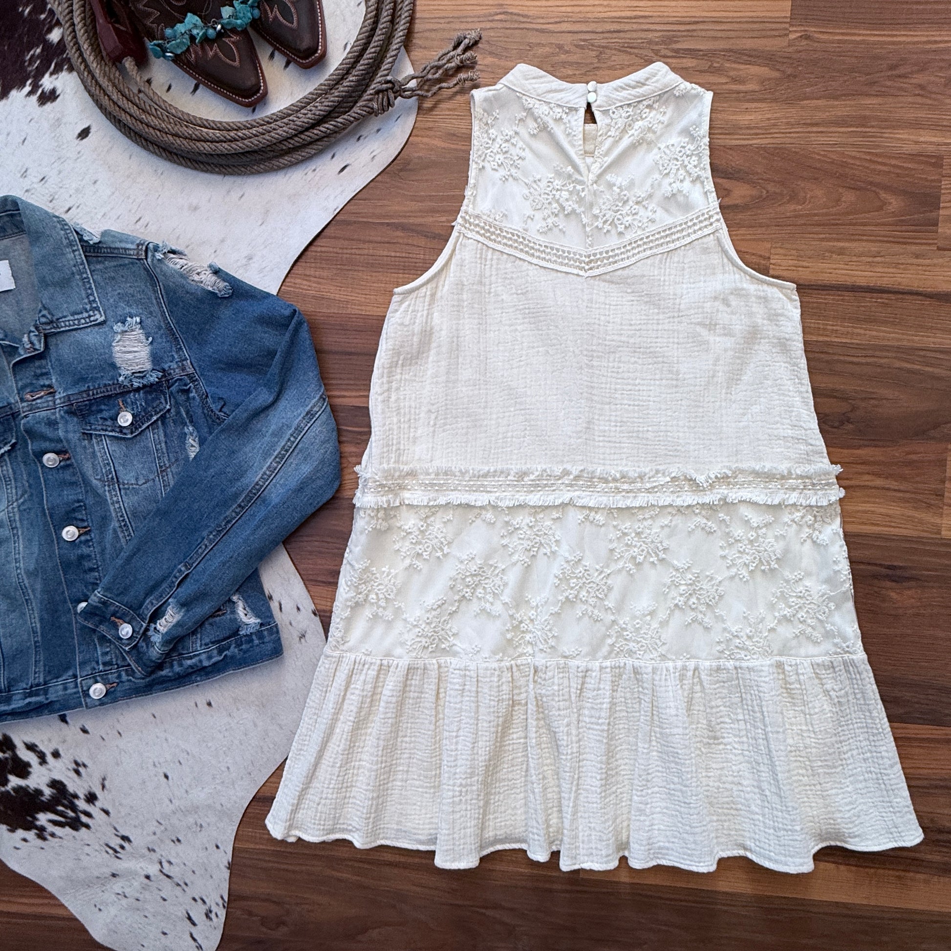 Sleeveless dress with embroidered lace overlay on the bodice, textured gauze skirt, and a tiered ruffle hem. Relaxed shift silhouette with a keyhole button-back closure. Fully lined.