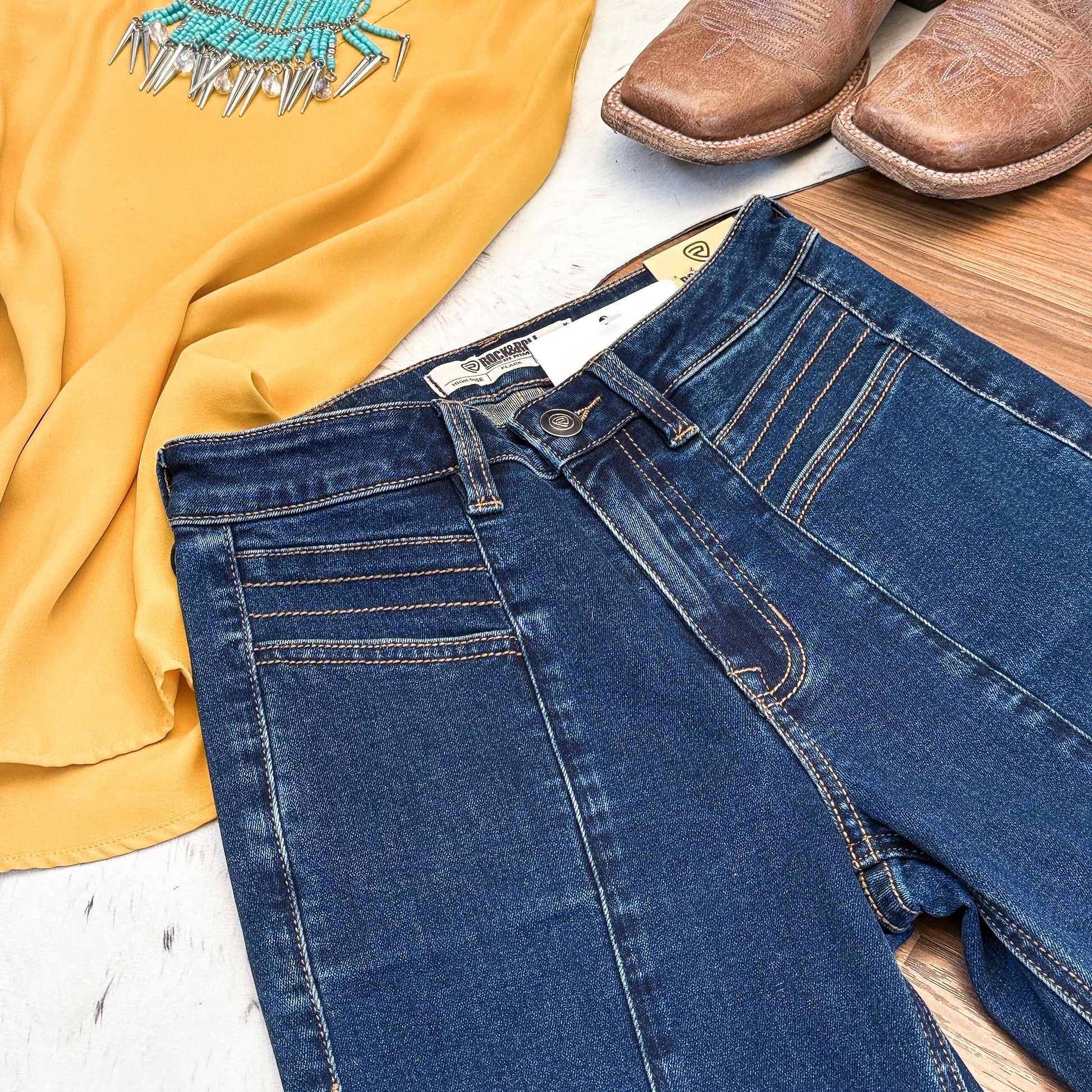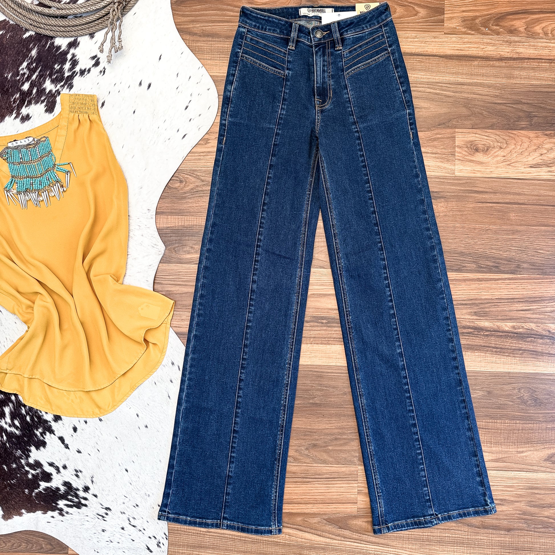 High rise relaxed flare jeans in a dark wash with angled slanted trouser-style front pockets, spade-shaped back pockets, and triple seam detail down the front of each leg. Made with extra stretch denim for flexibility and shape retention.