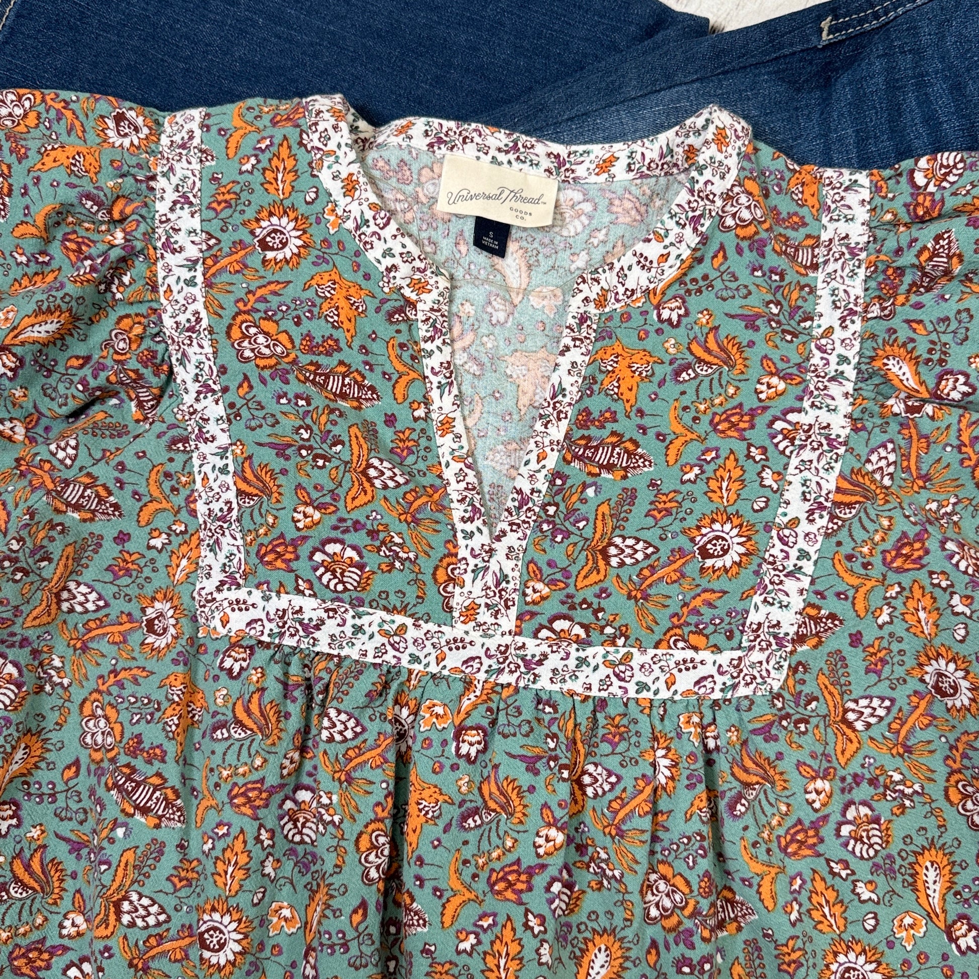 Puff Sleeve Floral Peasant Cotton Linen Top (Small)