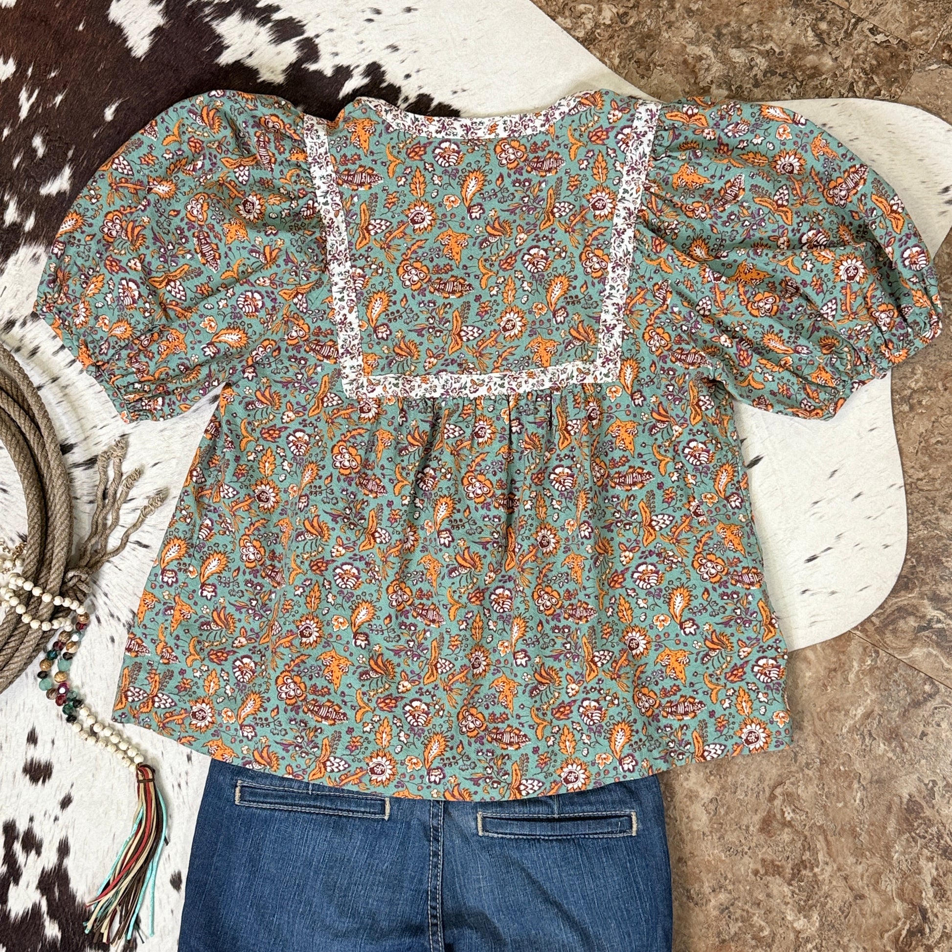 An easy, lightweight boho top with vintage-inspired charm. Soft cotton-linen fabric, puff sleeves, and a floral bib detail.