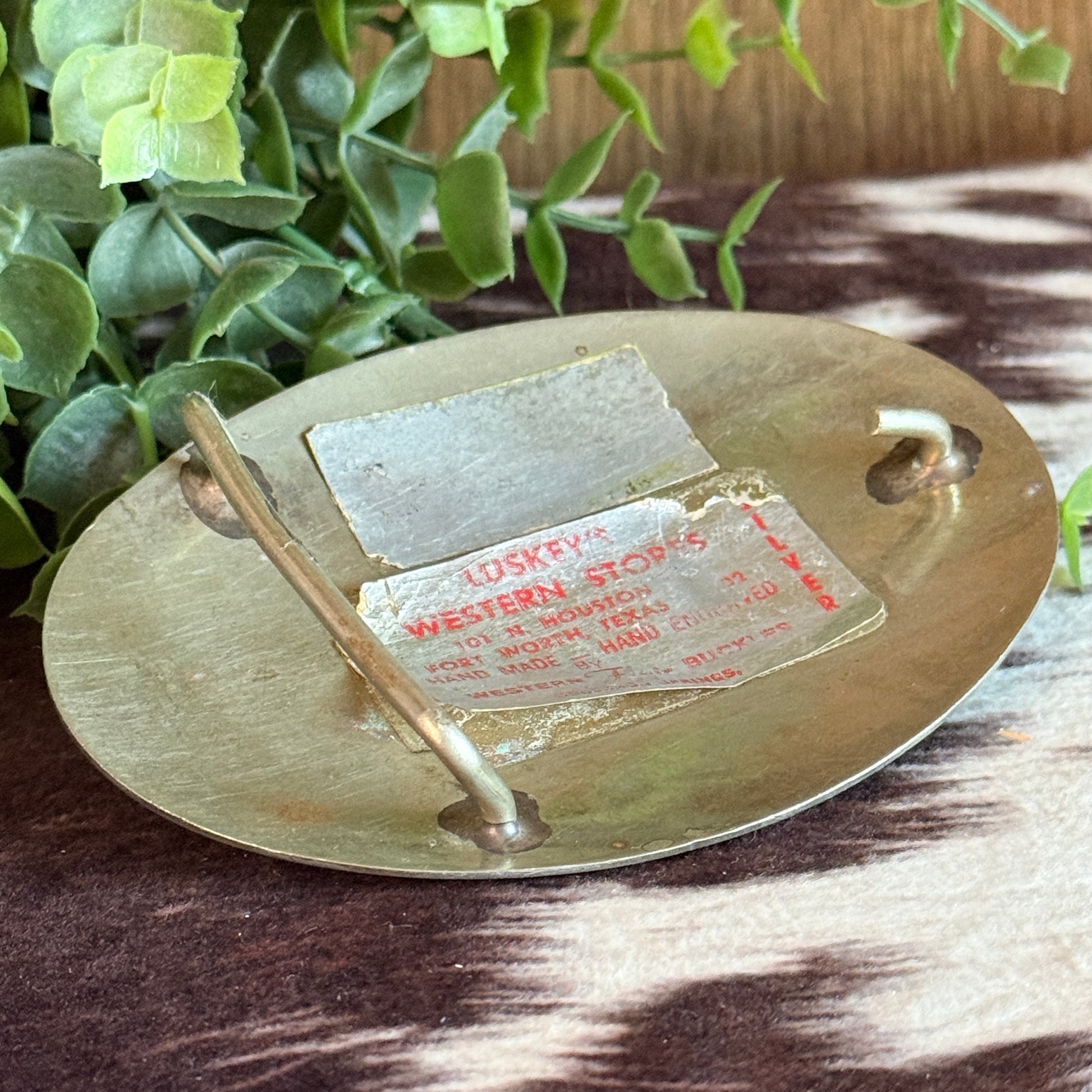 Silversmith crafted 1976 trophy buckle awarded at the Lubbock County 4-H Horse Show. Handmade and hand-engraved in Colorado by Western Flair Buckles and sold through Luskey’s Western Stores of Fort Worth, Texas — now part of Cavender’s (previously Luskey’s / Ryon’s Western Apparel family). Features a raised horse-and-rider figure, jeweler’s bronze banners.