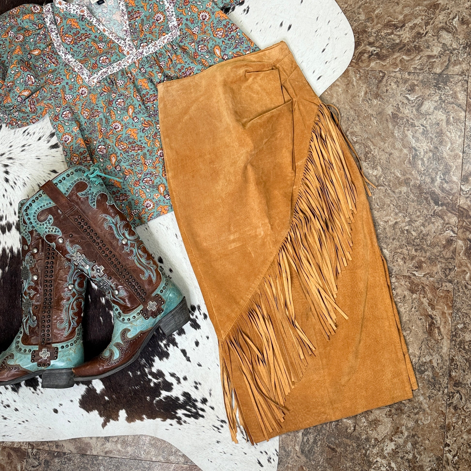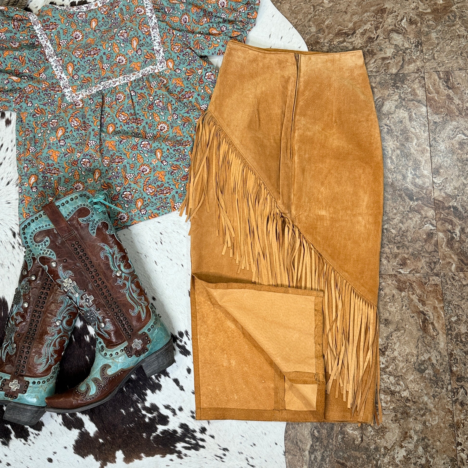 Gorgeous vintage genuine suede fringe skirt by Outerwear by Phoenix, made in the USA and fully lined. This piece has that classic 70s–80s Western silhouette with a true high-waist fit, dramatic diagonal fringe, and buttery soft real suede.