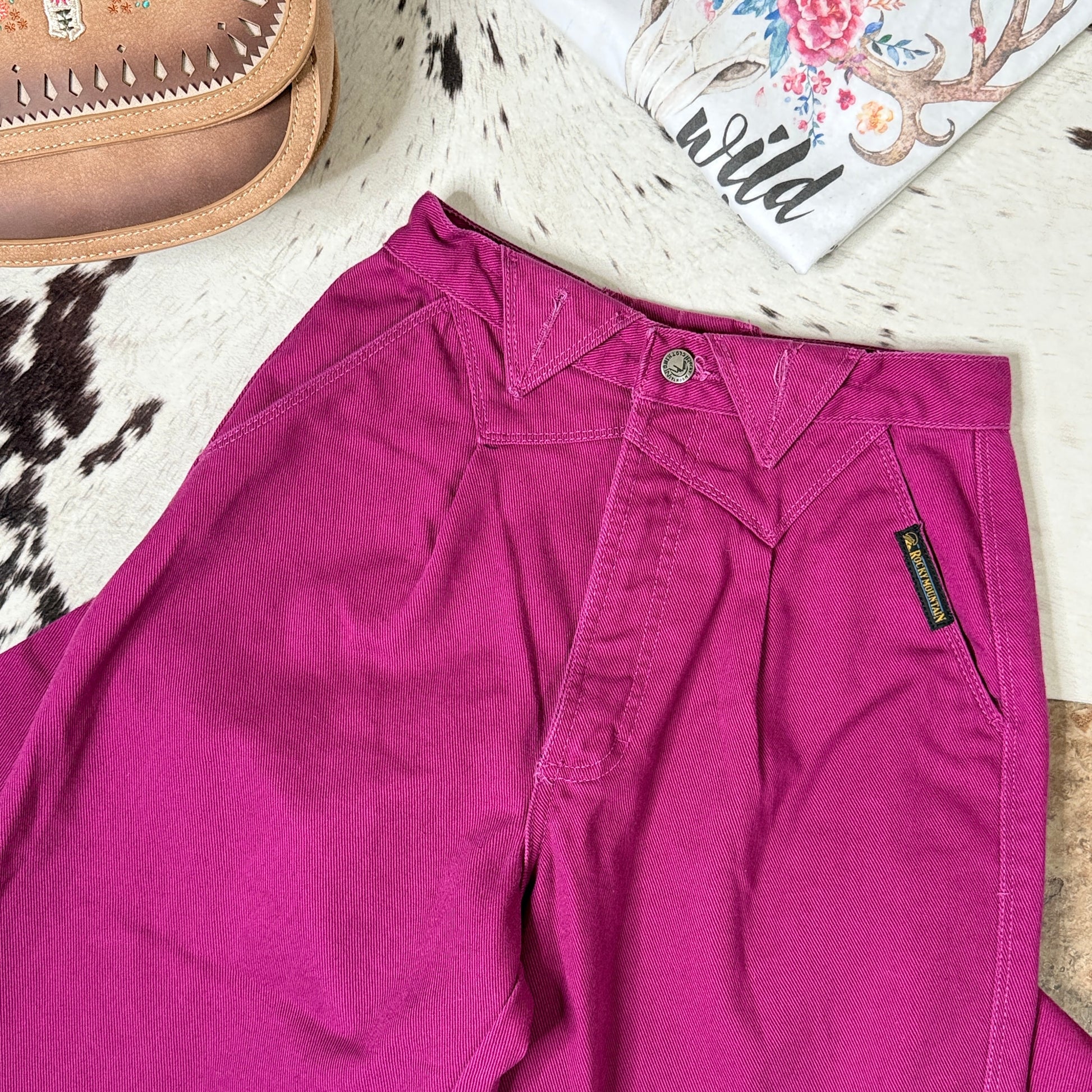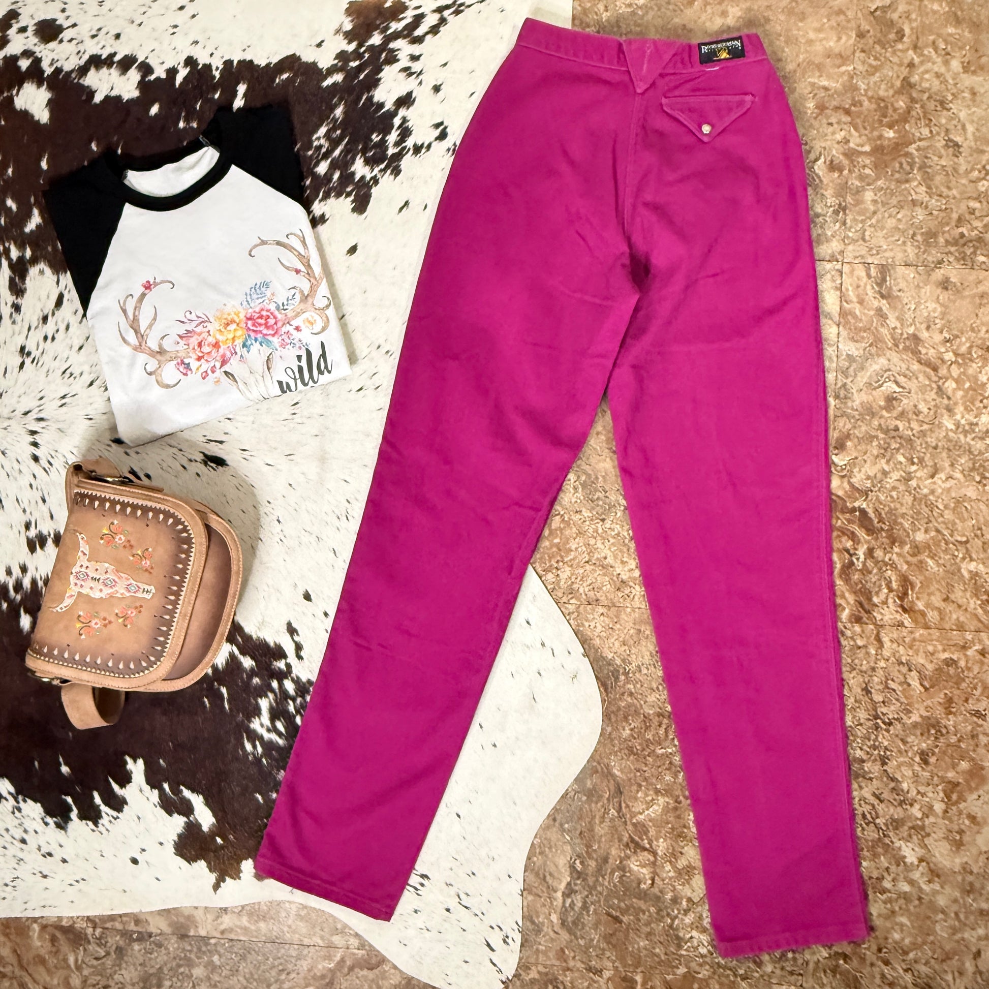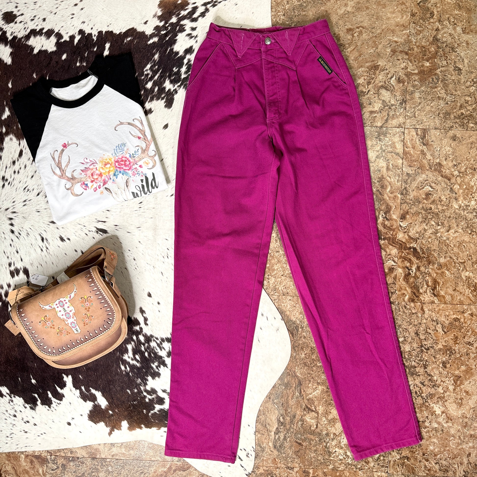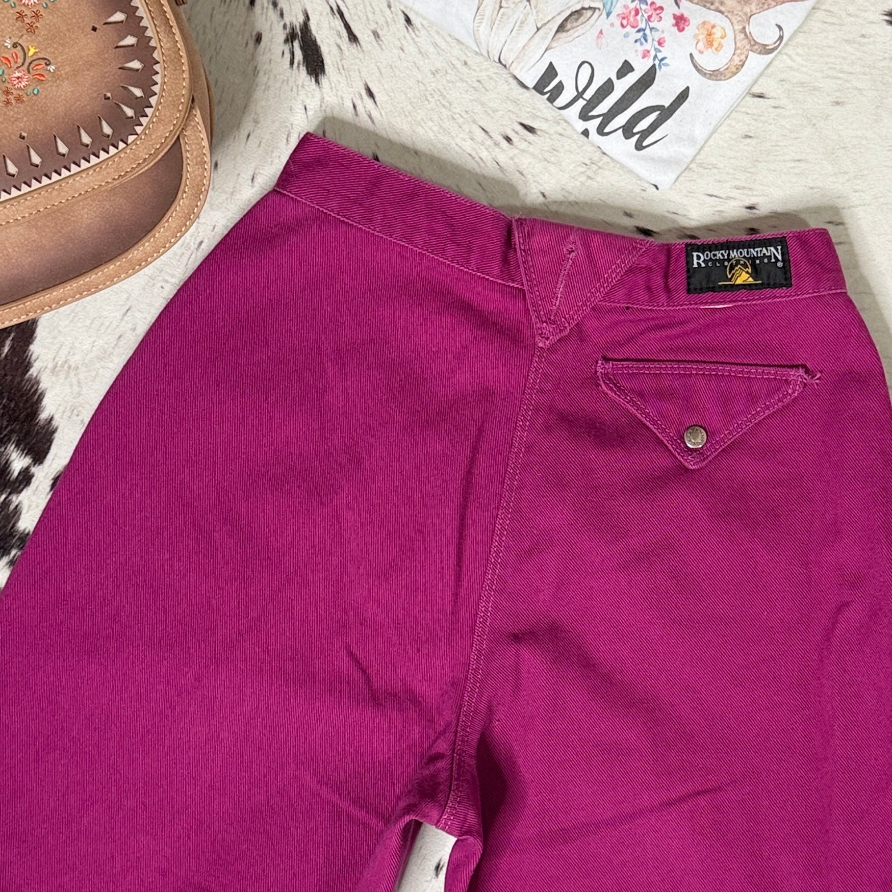 Gorgeous vintage Rocky Mountain jeans in a rich magenta color with the iconic triangle belt loops and angled back pocket. True high-rise fit with no fading, no wear. These look nearly unworn.